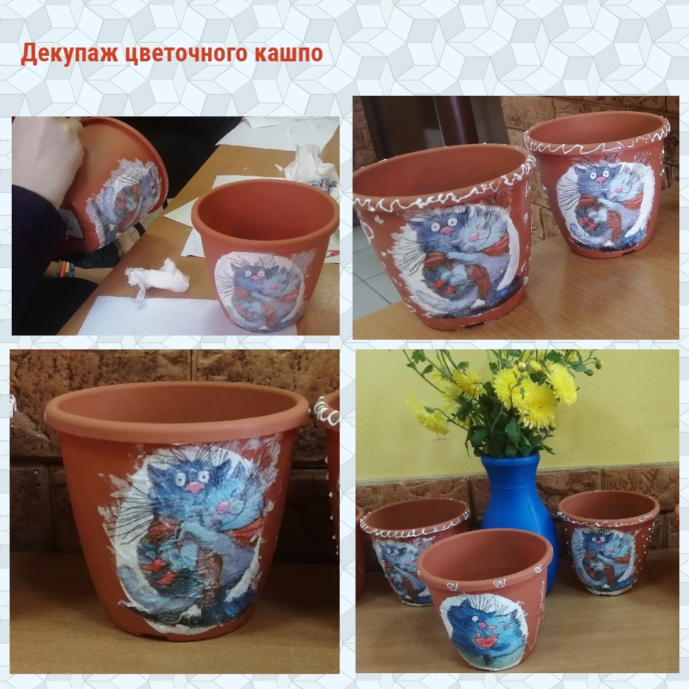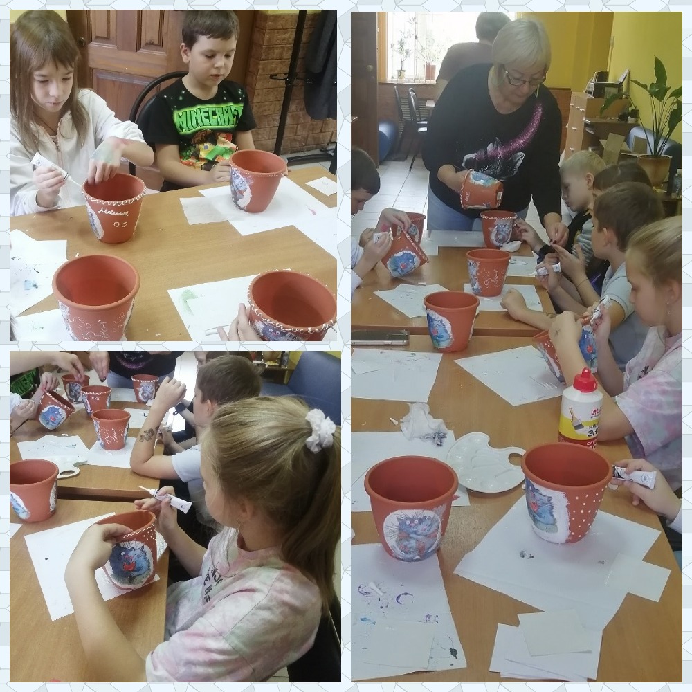 Некоторые ребята приняли участие в тематических мастер-классах по декорированию цветочного кашпо в технике декупажа и росписи бокалов в технике витражной росписи.