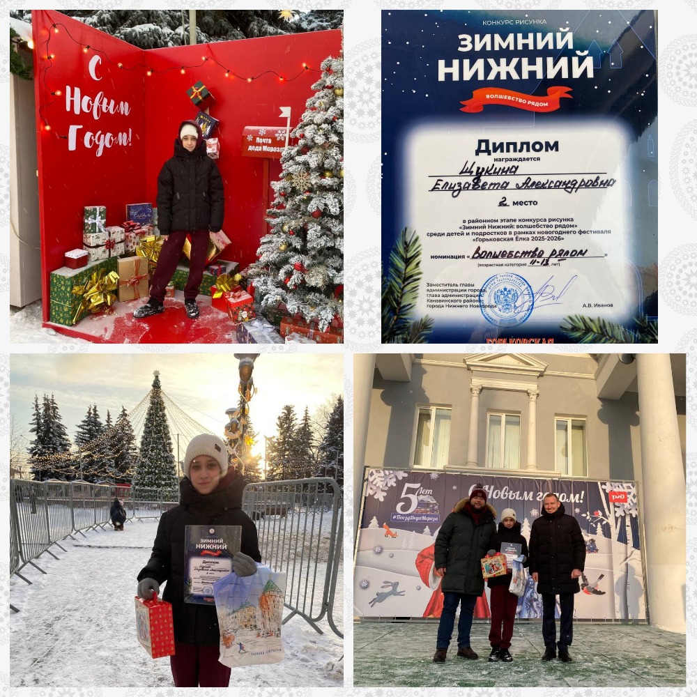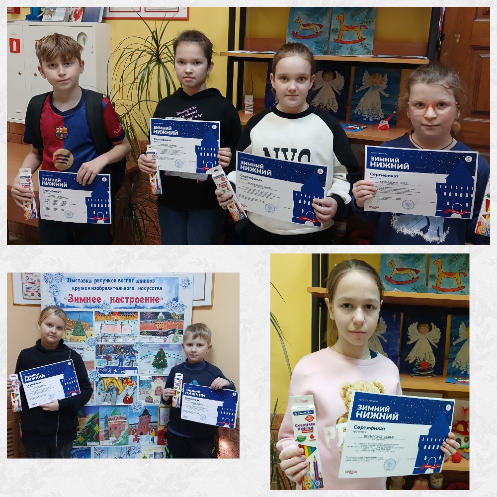 В рамках фестиваля 13 воспитанников кружка изобразительного искусства «Акварелька» приняли участие в районном этапе конкурса «Зимний Нижний: волшебство рядом», а Щукина Елизавета заняла 2 место и была награждена организаторами фестиваля Дипломом и памятным подарком. Все остальные ребята получили Сертификаты участника конкурса и сувениры от Смены.