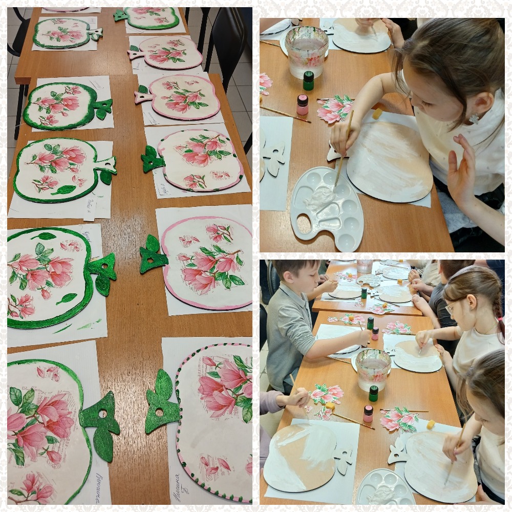 Для учащихся начальных классов школ Канавинского района прошли мастер – классы «Основы декупажа», на котором дети не только освоили эту технику, но и приготовили для своих мам замечательный подарок – украсили деревянную разделочную доску. Подарки получились очень красивыми, по-весеннему нежными и солнечными.